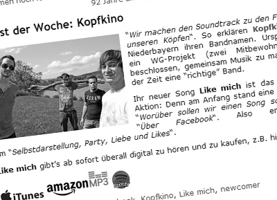 Premiere hatte die Debüt-Single "Like mich!" bereits in der NewcomerShow auf Bayern 3. Aktuell wird "Like mich!" sogar schon im Sonntags-Hit-Mix und in den Rockperlen der Nightlife-Show auf Bayern 3 gespielt. Weitere Radioplays und Presseanfragen folgten. „Like mich!“ erschien als erste Single auf iTunes, Amazon und in allen bekannten Download-Stores. Kopfkino wurde vom Online-Musik-Vertrieb "Zimbalam" als "Artist der Woche" ausgezeichnet.